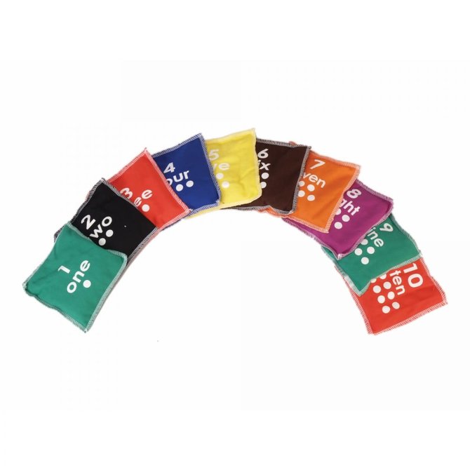 Numbers bean bags feature numbers and number names for visual recognition, as well as dots for tactile recognition. Bean bags are5"x5" and are sold in a set of 10.