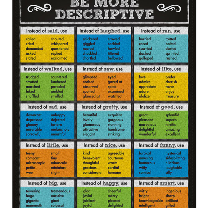 The colorful chalkboard design of the Be More Descriptive Chart is sure to capture the attention of your students while providing examples of words and their synonyms that make for more interesting writing. Display in a language arts center for students t