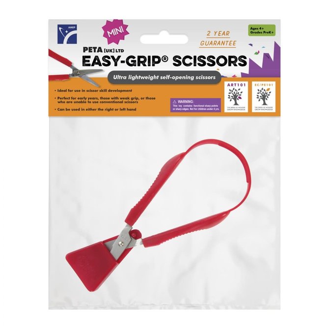 Ultra lightweight self-opening scissors. Ideal for use for early scissor skill development, for weak hands or those who are unable to use conventional style scissors. Mini Easi-Grip scissors are 2/3 the size of the standard version and due to the minimal