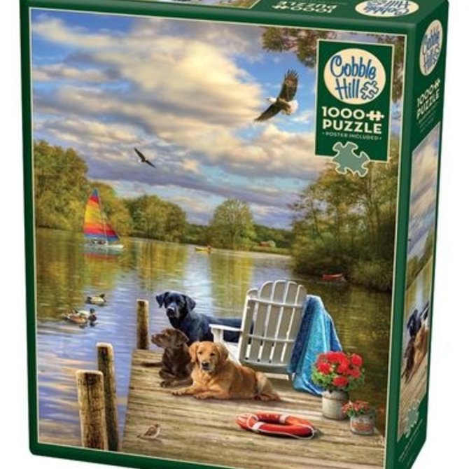 It's a Dog Day Afternoon on the docks with sailboats, kayaks, eagles and ducks all enjoying this sunshine filled day. Take an adventure with Cobble Hill's 1000 piece random cut puzzle that includes a reference poster.